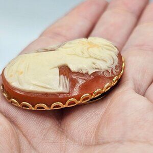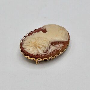 This vintage cameo brooch pendant exudes timeless elegance, showcasing intricate carving of a woman's profile. Its dual functionality adds versatility to any vintage collection.