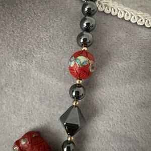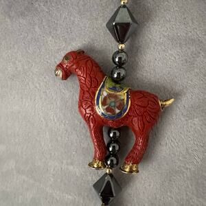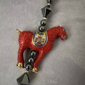 Vintage Carved Cinnabar Cloisonné Enamel Horse Hematite Beaded Necklace