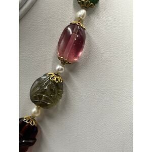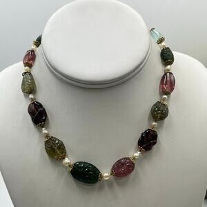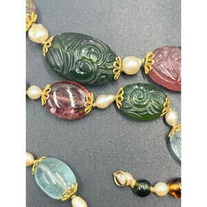 Vintage Carved Gems Pearl Jade Aquamarine Tourmaline 14k Clasp Necklace