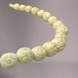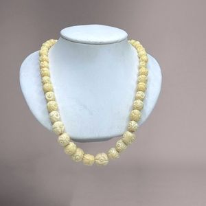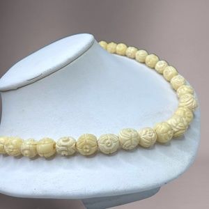 Gorgeous vintage necklace made with several beads hand carved out of bone or horn. The beads are rose/flowers, with the largest at the bottom middle, and smaller towards the neck. it has an oblong twisting on clasp that is also carved horn. I first thought it was celluloid, but upon closer inspection, it is a natural material. This is really a beautiful piece with lots of detailing. Measures 18.5' long. CB