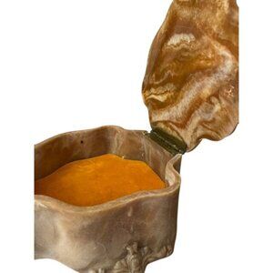This vintage jewelry box, crafted from Incolay Stone, features an intricate cherub design. It's lined with a vibrant orange fabric, offering a striking contrast. The box is ideal for showcasing and protecting your most treasured items, combining aesthetic appeal with functionality.