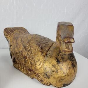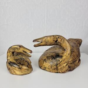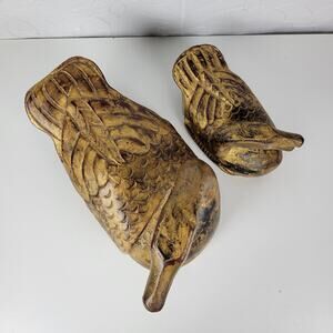 Vintage 1960's 2pc Italian Wood Carved Duck Statue Gold Brown Home Garden Decor