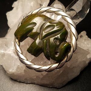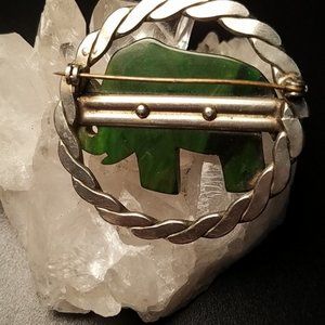 This vintage lucky elephant brooch is carved from deep green bakelite marbled with butterscotch. The carving is well done with no chips or cracks and a good polish. He is quite thick. The frame is twisted silver tone metal. The brooch is 2" across.