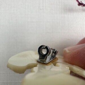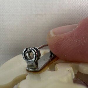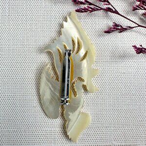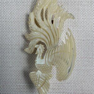 This intricately carved brooch features a fancy rooster motif in shimmering mother-of-pearl. Its snap-in clip back ensures secure wear.