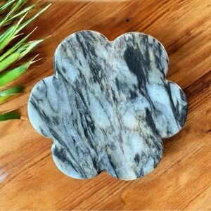Add a touch of natural beauty to your space with this vintage carved stone trinket dish. Made of onyx in earthy tones of white, beige, gold, and black, this unique piece features a flower-shaped lid and base with a sturdy round bowl center. Perfect for storing small jewelry, crystals, or keepsakes.