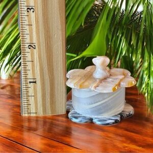 Keywords: stone trinket box, onyx container, carved stone decor, crystal bowl, flower box, vintage home decor, boho, neutral stone decor, vanity jar