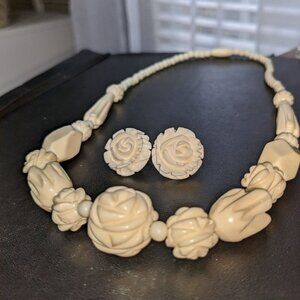 Vintage Carved Rose Necklace and Clip-on Earrings Set