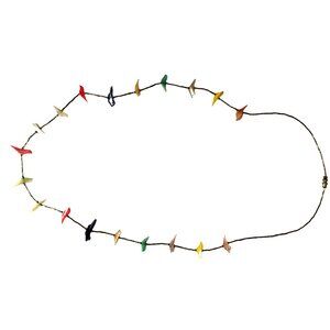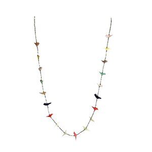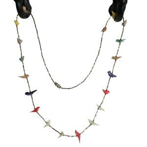 Charming vintage necklace featuring an array of hand-carved multicolor stone or dyed shell birds strung on natural fiber cord.