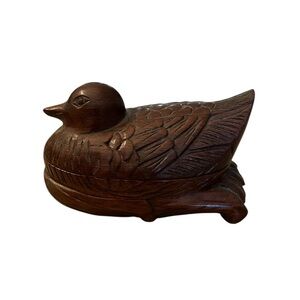 Gorgeous detailed carved duck trinket box in a dark wood with a stain on it