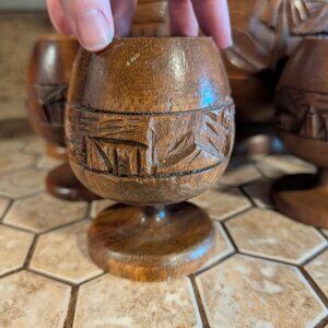 Vintage Carved Wood Punch Bowl & 5 Cups