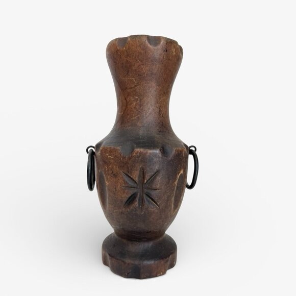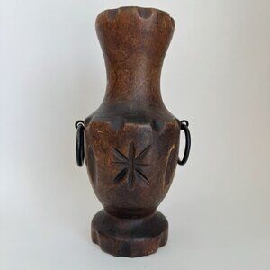 A very unique hand carved / hand turned wooden vase with metal ring handles. Measures approx 8" tall x 5" wide. This vase would make a great addition to any Polynesian or Tiki themed collection.