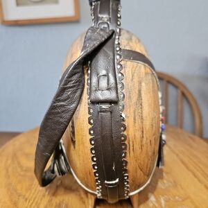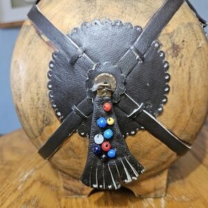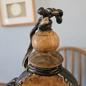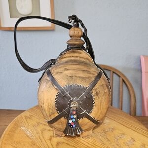 Beautiful craftsmanship on this carved wooden flask. Has a leather strap that wraps around with detailing. Screw on top is attached with a leather cord.