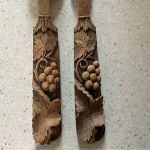 An intricate grape and leaf pattern is carved on the handles of this wooden fork and spoon set. Excellent vintage condition. Each utensil is approximately 10” long.
