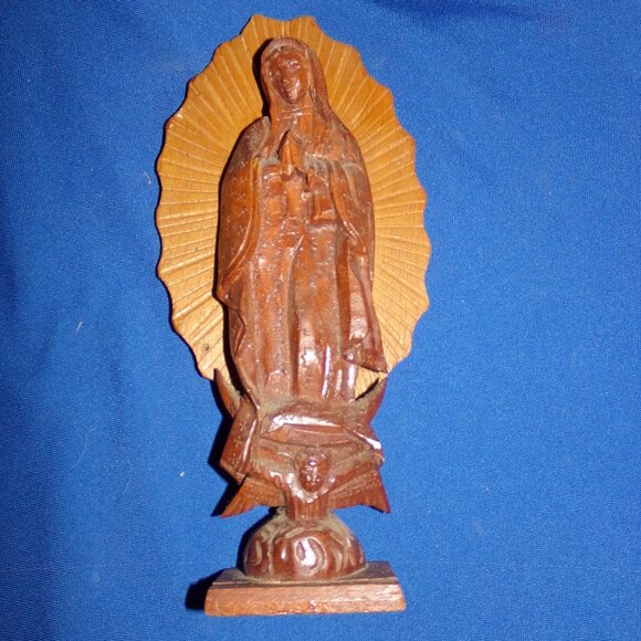 Vintage Carved Wooden "Our Lade of Guadalupe?" Virgin Mary Madonna w/ Jesus Shelf Display Statue Figurine