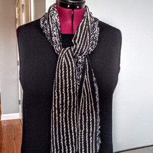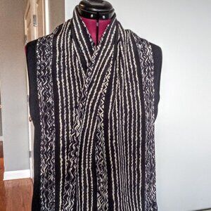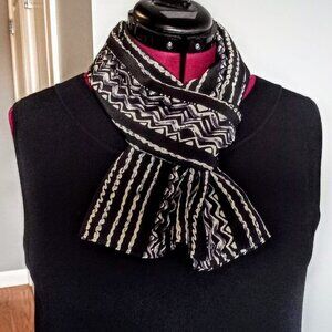 Vintage silk print oblong scarf from Casca in shades of cream, slate blue grey and black.