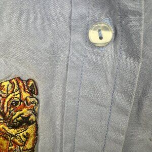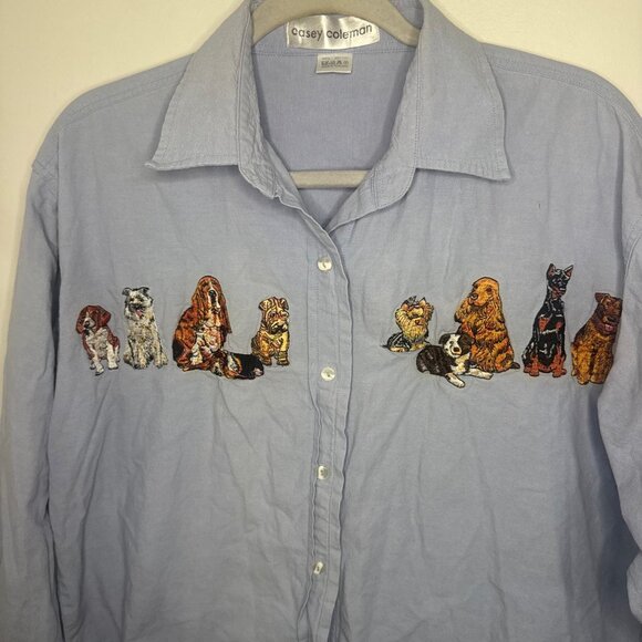 The Vintage Casey Coleman Denim Shirt is a stylish and comfortable addition to any woman's wardrobe. This shirt features embroidered dogs, a collared neckline, long sleeves, and a button closure, making it perfect for casual occasions. Made from 100% cotton denim in a classic blue color, this shirt is machine washable and suitable for all seasons. With a regular fit and a nod to 90s fashion, this vintage piece from Casey Coleman is a must-have for dog lovers and those looking to add a unique touch to their outfit.