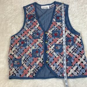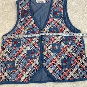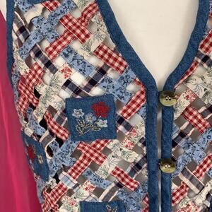Vtg Casey & Max denim vest, with lattice gingham and embroidered patches. Size medium. There is a denim tie attached to back, and swirled buttons. Colors of red white and blue give this jean vest a decided American feel.
