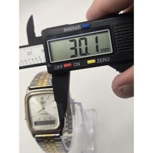 The Vintage Casio AQ-307 Gold Tone 30mm Analog-Digital Watch is a timeless timepiece that combines the classic design of an analog watch with the functionality of a digital display. With a 30mm case size, this watch is compact and stylish, perfect for everyday wear. The new battery ensures reliable timekeeping, making it a practical and reliable accessory for any occasion. The Casio brand is known for its durability and quality, making this vintage watch a valuable addition to any collection.