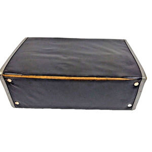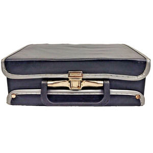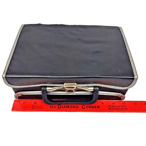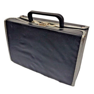 Vintage Black vinyl cassette case is in used, but in fair condition. Rough outer-shell. Vinyl on back lid is worn.
