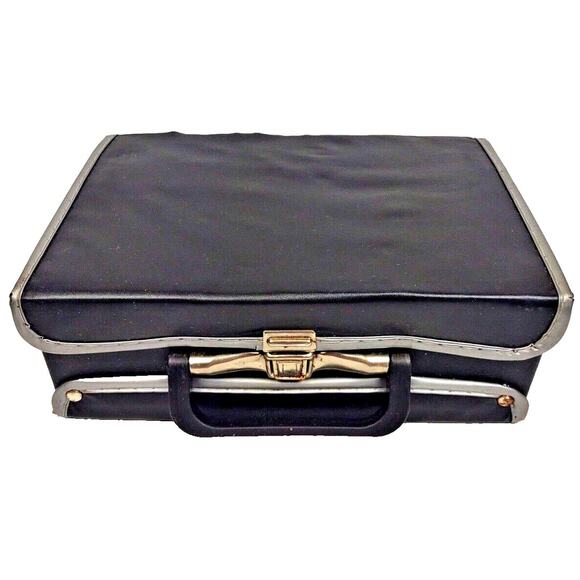 Vintage Black vinyl cassette case is in used, but in fair condition. Rough outer-shell. Vinyl on back lid is worn.