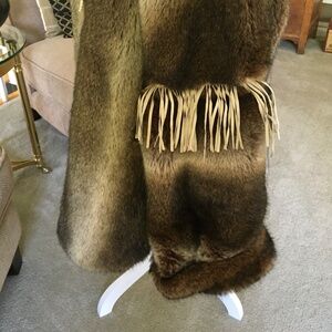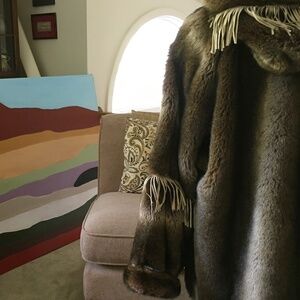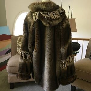 Gorgeous, unique, and very warm vintage Cassini (made in France) faux fur coat size L. Has a hood and fringe on arms and on buttons.