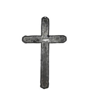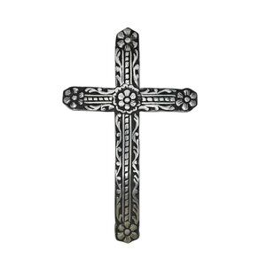 This handcrafted Mexican tin wall cross features an intricate floral design, offering a timeless and sophisticated piece for home decor. Measuring 16 7/8 inches in length, its elegant silver and black finish adds a touch of craftsmanship to any space, enhancing its aesthetic appeal.