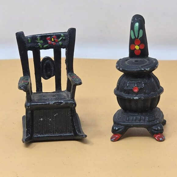 This intricate miniature set, featuring a rocking chair and stove salt and pepper shakers, showcases hand-painted floral details on durable cast iron. A charming collectible or decor accent.
