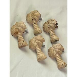This set of five Palm Tree drawer pulls are in excellent condition. No rust at all, only some chippy paint. Each one is 2.5" tall and has a 7/8" screw. Substantial and heavy. Perfect for that coastal look you really want.
