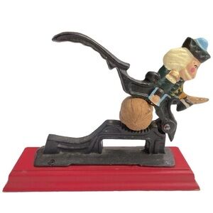 Vintage Cast Iron Paul Revere Soldier Nut Cracker on Red Wood Base Collectible
