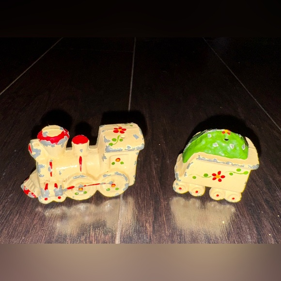 Vintage Cast Iron Salt and Pepper Shakers in shape of Train Engine & Coal Car with painted floral design. Heavy & durable cast iron. Normal vintage wear to the paint. Charming addition for collectors or train enthusiasts.