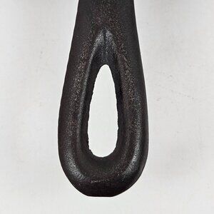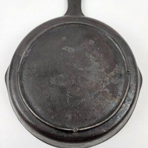 This vintage cast iron skillet features a classic design with a heat ring and double pour spouts. Ideal for cooking enthusiasts or collectors, this skillet is durable and versatile for various cooking needs.