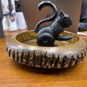 Fun and quirky critter nutcracker. Hollowed out wood bark bowl with cast iron squirrel. The tail is the lever and the mouth cracks the nuts.