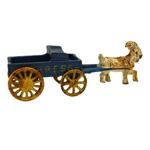 Vintage Cast Iron Goat Pulling Blue Express Wagon with Yellow Spoked Wheels – Hubley Style Reproduction – Farmhouse Americana Toy Decor