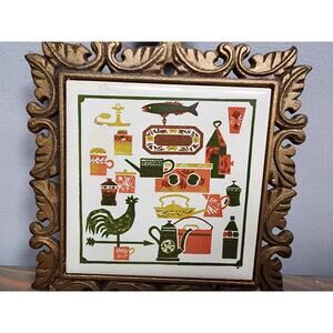 This vintage cast iron trivet features a rooster ceramic tile from Japan, showcasing mid-century modernism with a square shape and black, green, and maroon color palette. The item stands at 9 inches in length and 5.5 inches in width, making it perfect for all occasions and suitable for hot or cold food. The trivet is a unique kitchen tool with an iron handle, adding a touch of retro charm to any collection with its original design and theme of rooster/kitchen style.