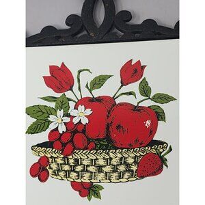 This vintage cast iron trivet combines functionality with rustic charm. Adorned with a vibrant fruit basket design, it adds a decorative touch to any kitchen or dining area while offering durable heat protection. Perfect for displaying or practical use.