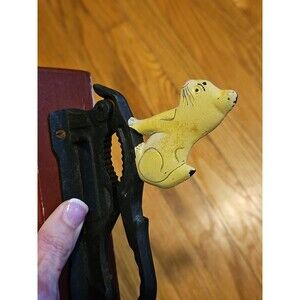 Vintage Cast Iron White Cat Nutcracker On Wooden Base