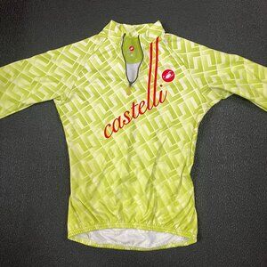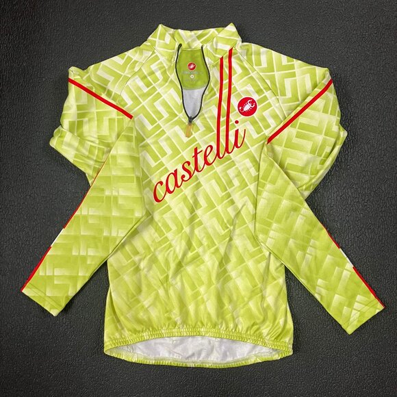 Cool cycling/bike jersey, long-sleeved with a brushed flannel-like interior side. Neon green/yellow color with red trim.