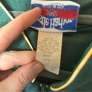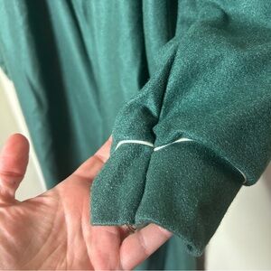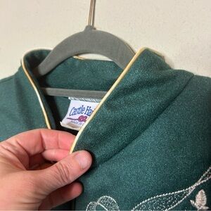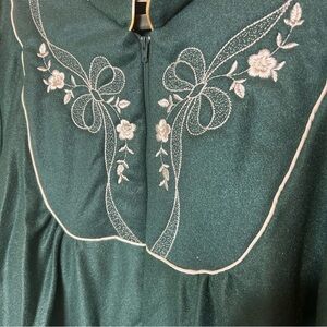 Deep green house dress with zipper. Long sleeves with floral embroidery. The white ribbon around the collar has some yellow that comes with age on it. Otherwise, the piece is in very good used condition.