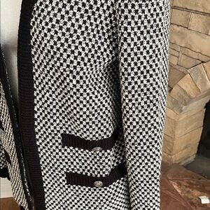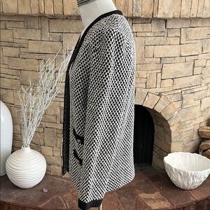 Elevate your wardrobe with this chic black and white jacket. Perfect for any occasion, this stylish piece offers a timeless look.