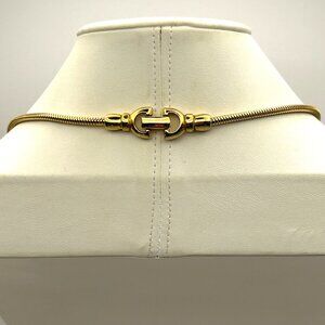 Vintage necklace by Castlecliff featuring a large sculptural pendant with an openwork ladder design in gold tone. The pendant hangs from a thick gold tone snake chain with a secure fold over clasp. Designer signature on reverse.