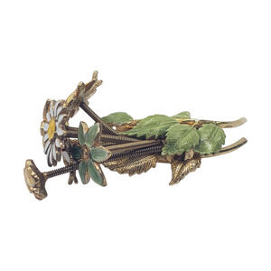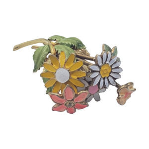 Design: Multi-flower bouquet featuring enameled daisies in yellow, white, pink, and mint with green enamel leaves. Many flowers are on a spring coil stem that allows them to "tremble" or move.