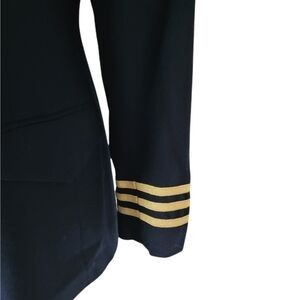 Excellent pre owned condition. Vintage - Casual Corner Navy and Gold Military Style Blazer. Mandarin collar. Gold trim. Gold button down front. 100% Wool. Fully lined.