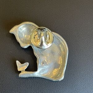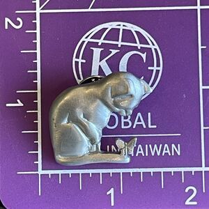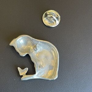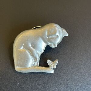 Vintage unsigned adorable whimsical silver tone possibly pewter? Cat and butterfly pin. Please see photos for size and condition