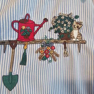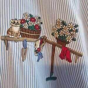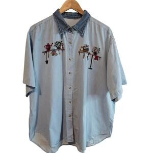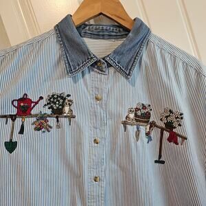 Vintage Cat Blouse Women 3X Blue Floral Denim Collar Plants Cottage Preppy Retro