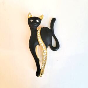 Vintage Black Enamel Cat Gold Tone Rhinestone Brooch Pin Catcore