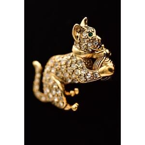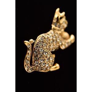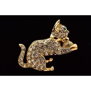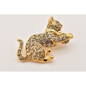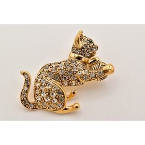 Vintage Cat Brooch Pin Pave Rhinestone Crystal Gold Tone Shiny 1980s BinBG