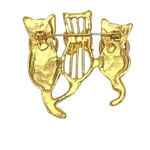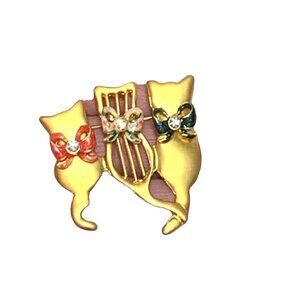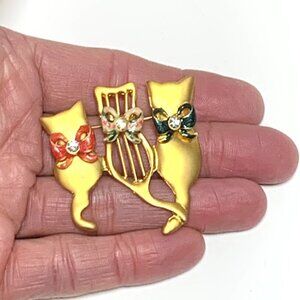 Vintage Cat Brooch Trio of Cats With Crystal Bows Gold Red Green Estate 3"