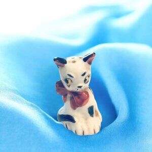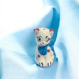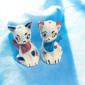 This is a set of cat & dog salt and pepper shakers. They were made in Pico, Japan. They are ceramic and hand painted, with big bows in red and blue. Original cork stoppers. Cat is 2” tall x 1.5” wide. Dog 2.25” tall x 1.5” wide. Vintage 1960 Pico, Japan