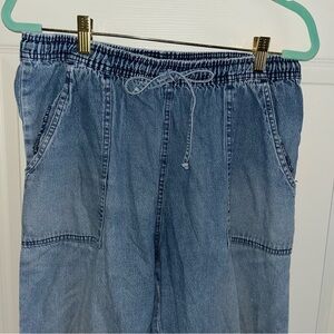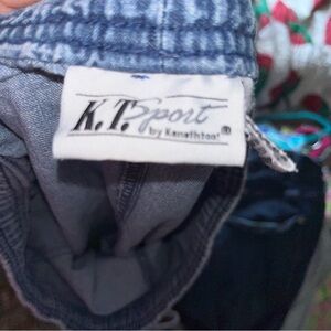 Vintage Cat Embroidered Blue Denim Pants Jeans KT Sport 31” M cropped retro elastic waist drawstring