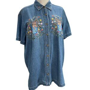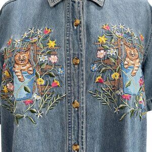 Vintage Cat Embroidered Denim Shirt Cottagecore Coquette Whimsical Floral